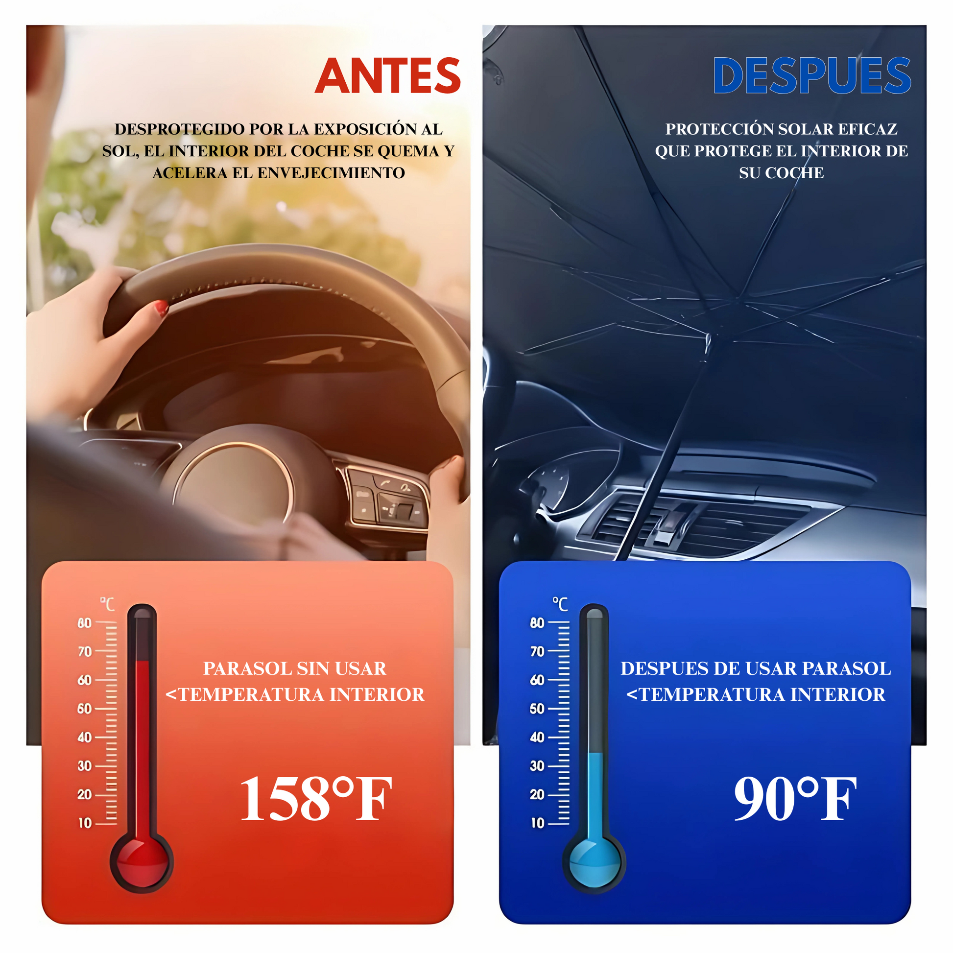 Con nuestro Parasol‑Paraguas para Parabrisas, creas un escudo inmediato contra los rayos UV y el calor intenso: